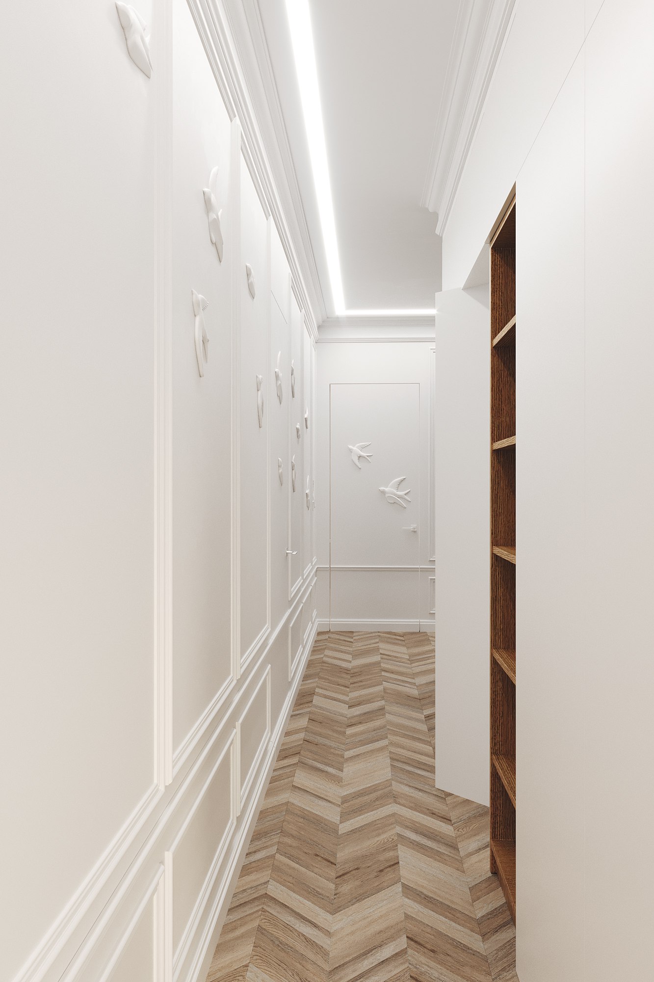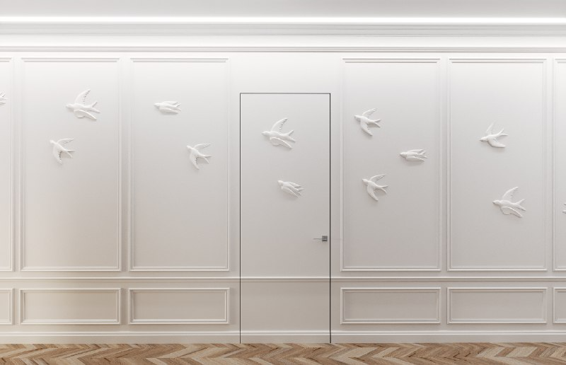 По стене расположены птицы Леонида Кима как олицетворения потока